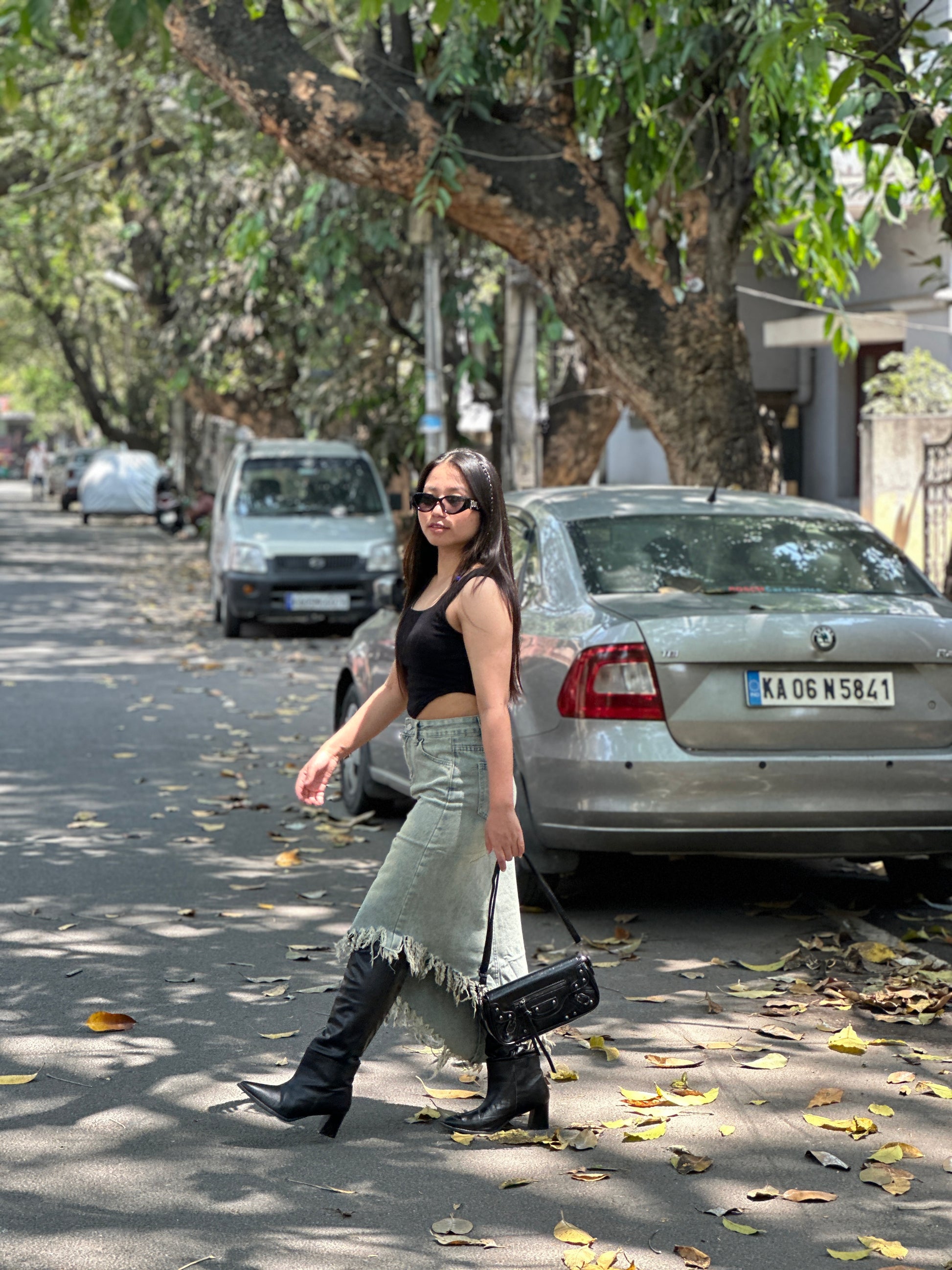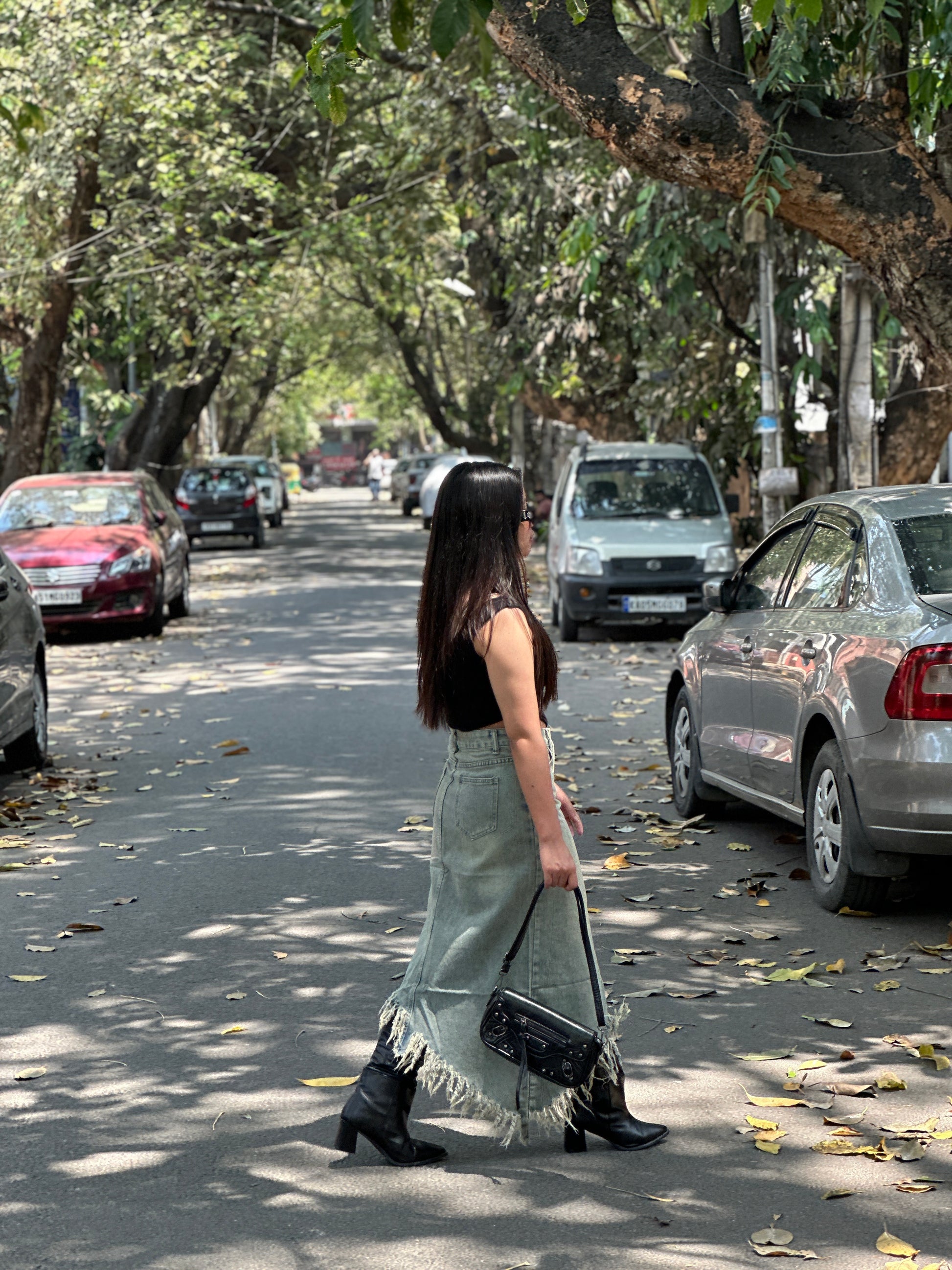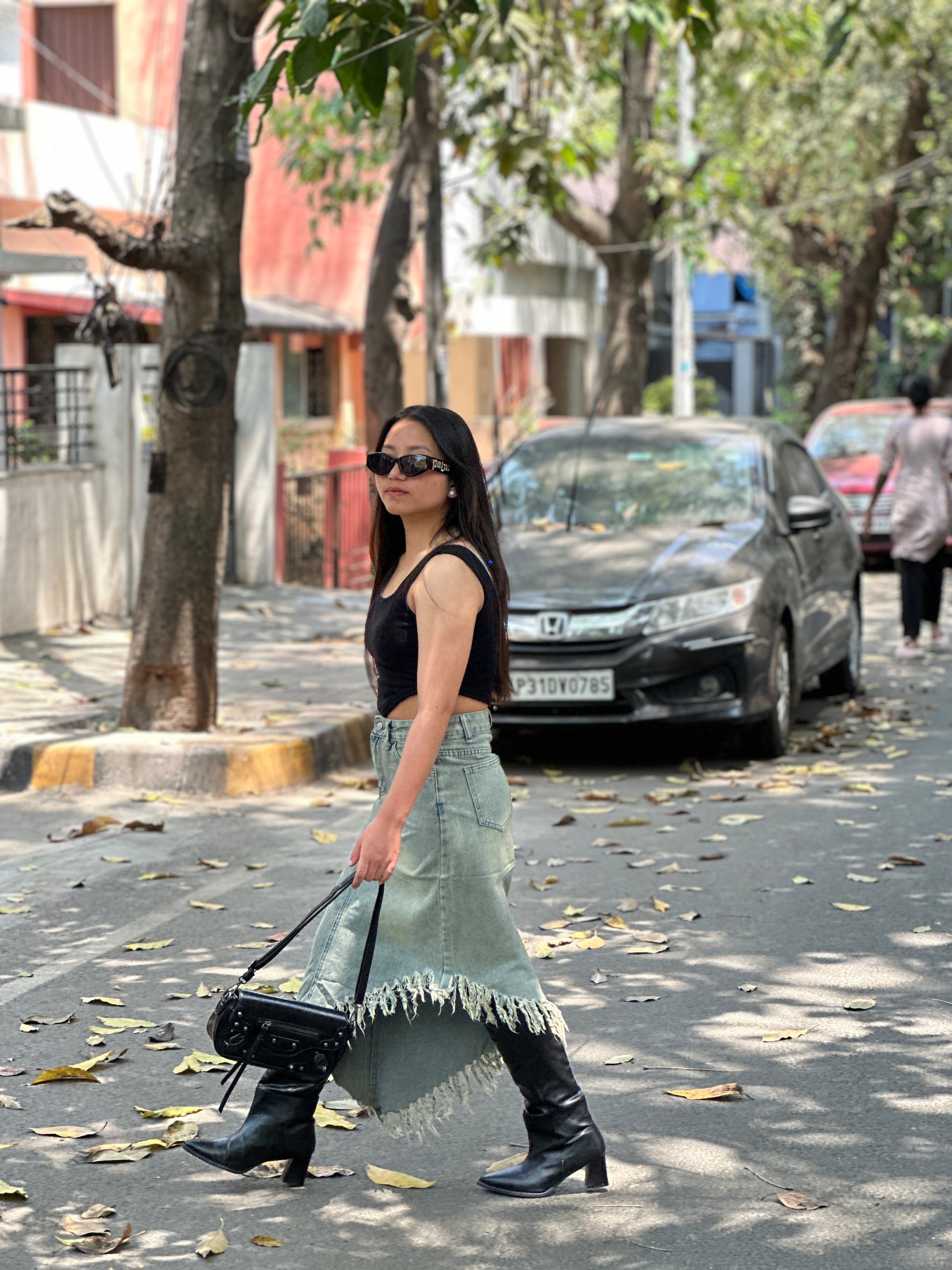 Classic denim, reimagined. This cowgirl-inspired skirt features a unique asymmetrical raw hem that brings bold edge to a timeless silhouette. The flattering midi length adds just the right touch of elegance, balancing rugged charm with refined style. Pair it with boots.