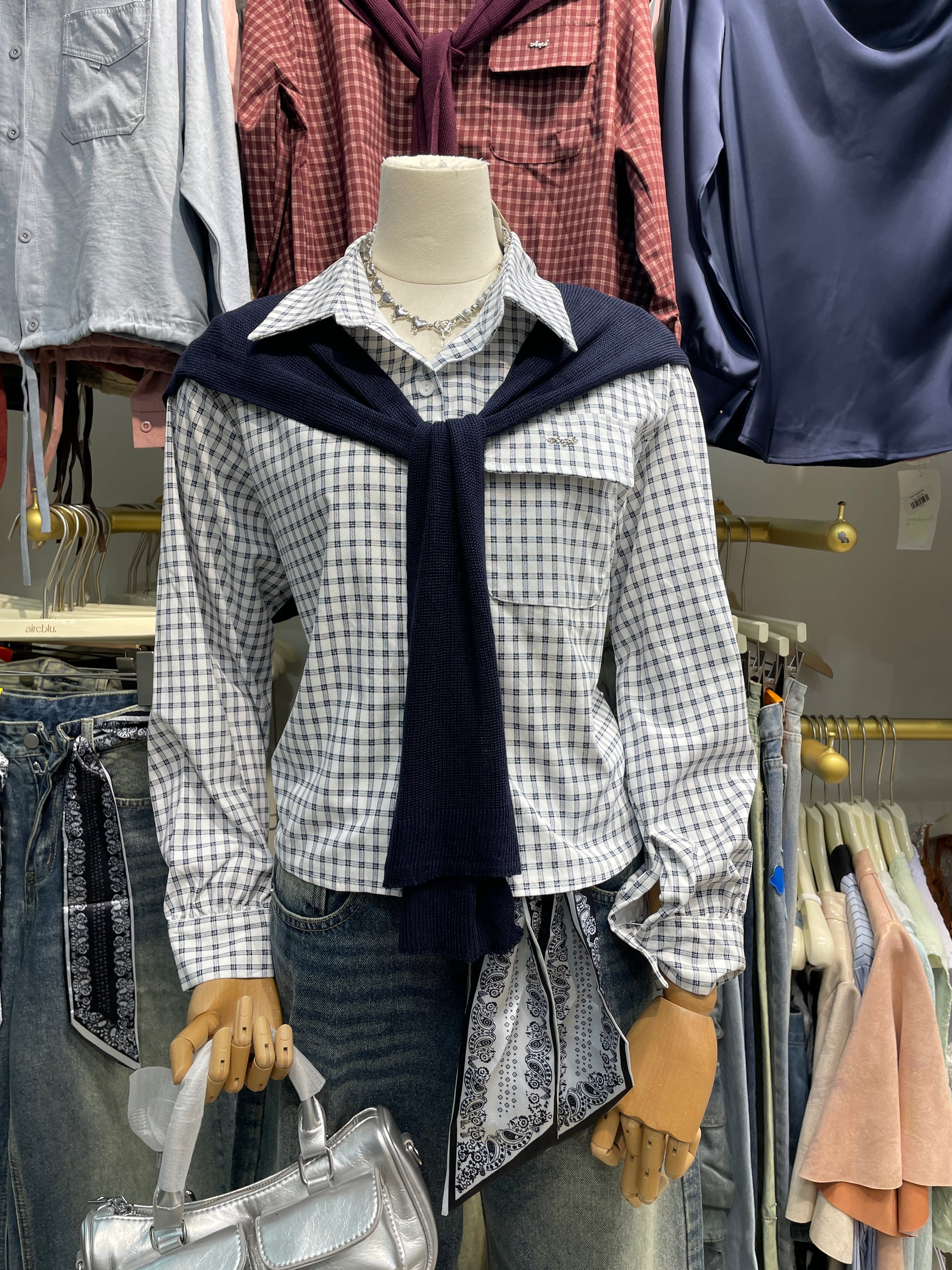 Where preppy charm meets modern Korean street fashion — this checkered crop shirt comes with a detachable knit overlay for two stylish looks in one.