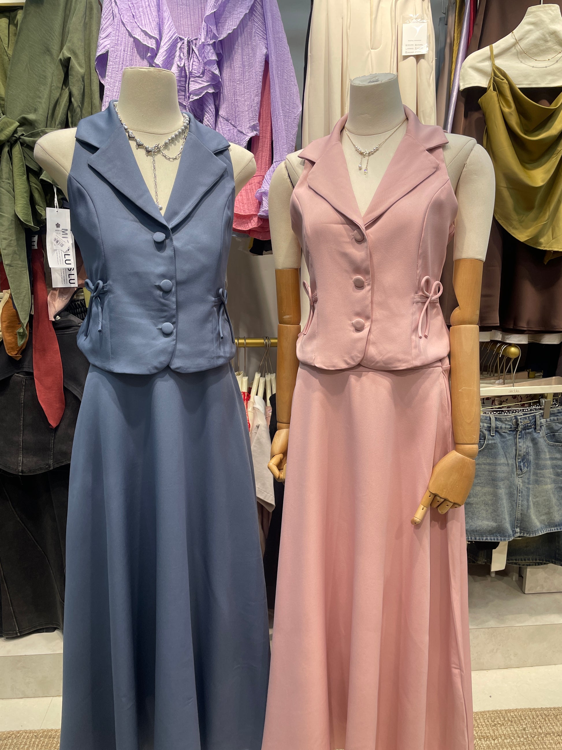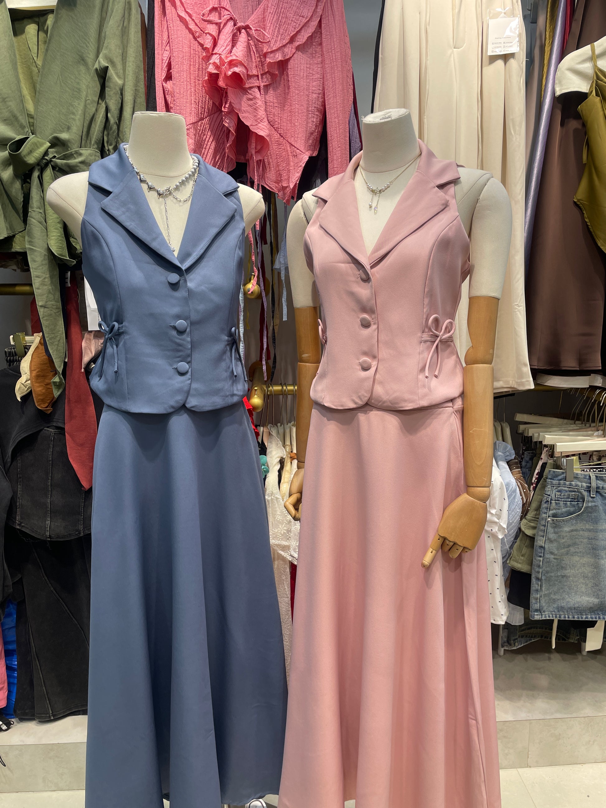 Two-piece coord set: tailored sleeveless vest + flowy maxi skirt