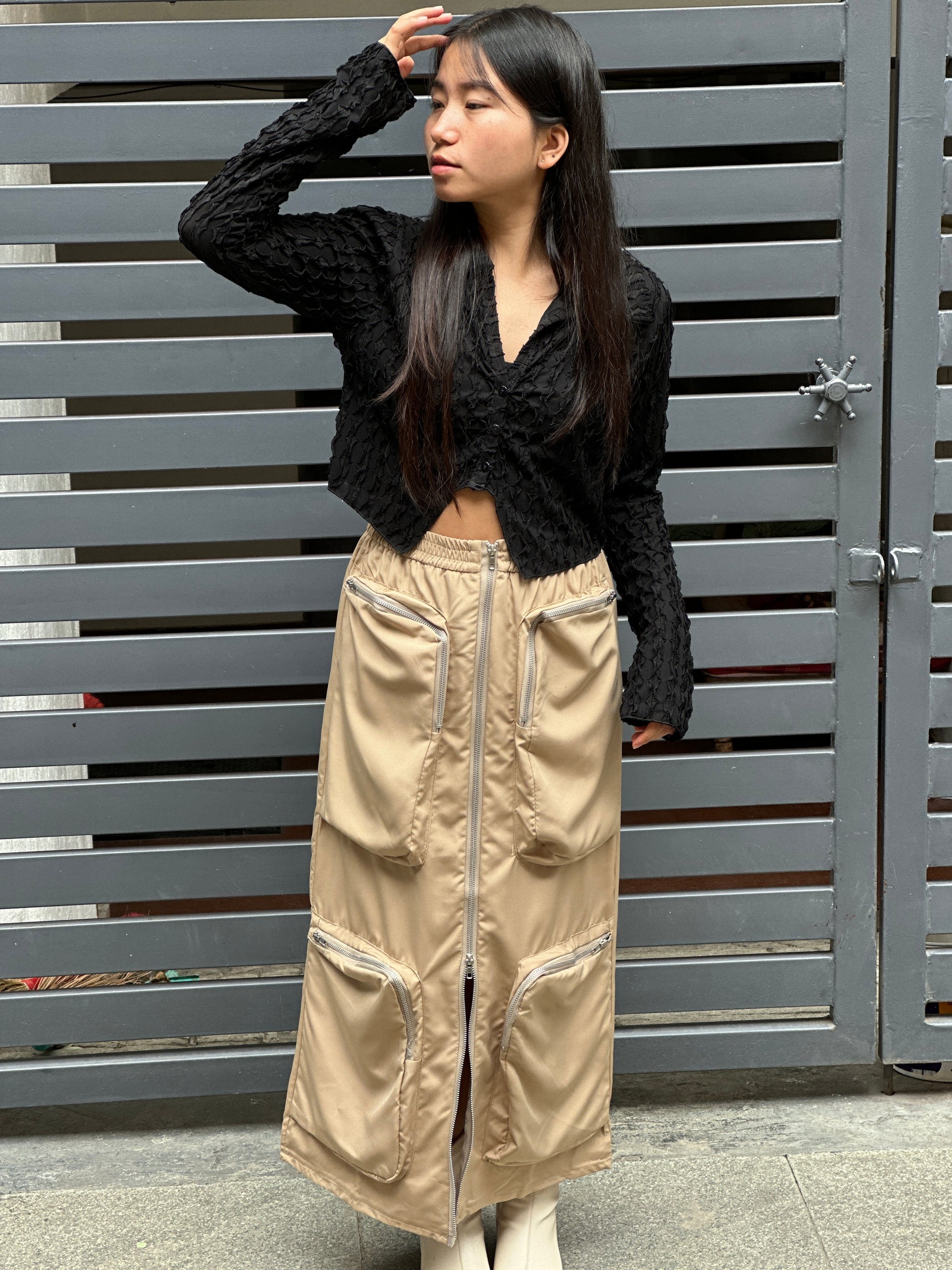 Crafted in premium material for a softer feel and richer finish, the Premium Cargo Zipper Pocket Skirt brings a luxe twist to streetwear. It still has the full zipper and utility pockets you love — just dressed up in elevated fabric that takes the look from casual cool to runway-ready.