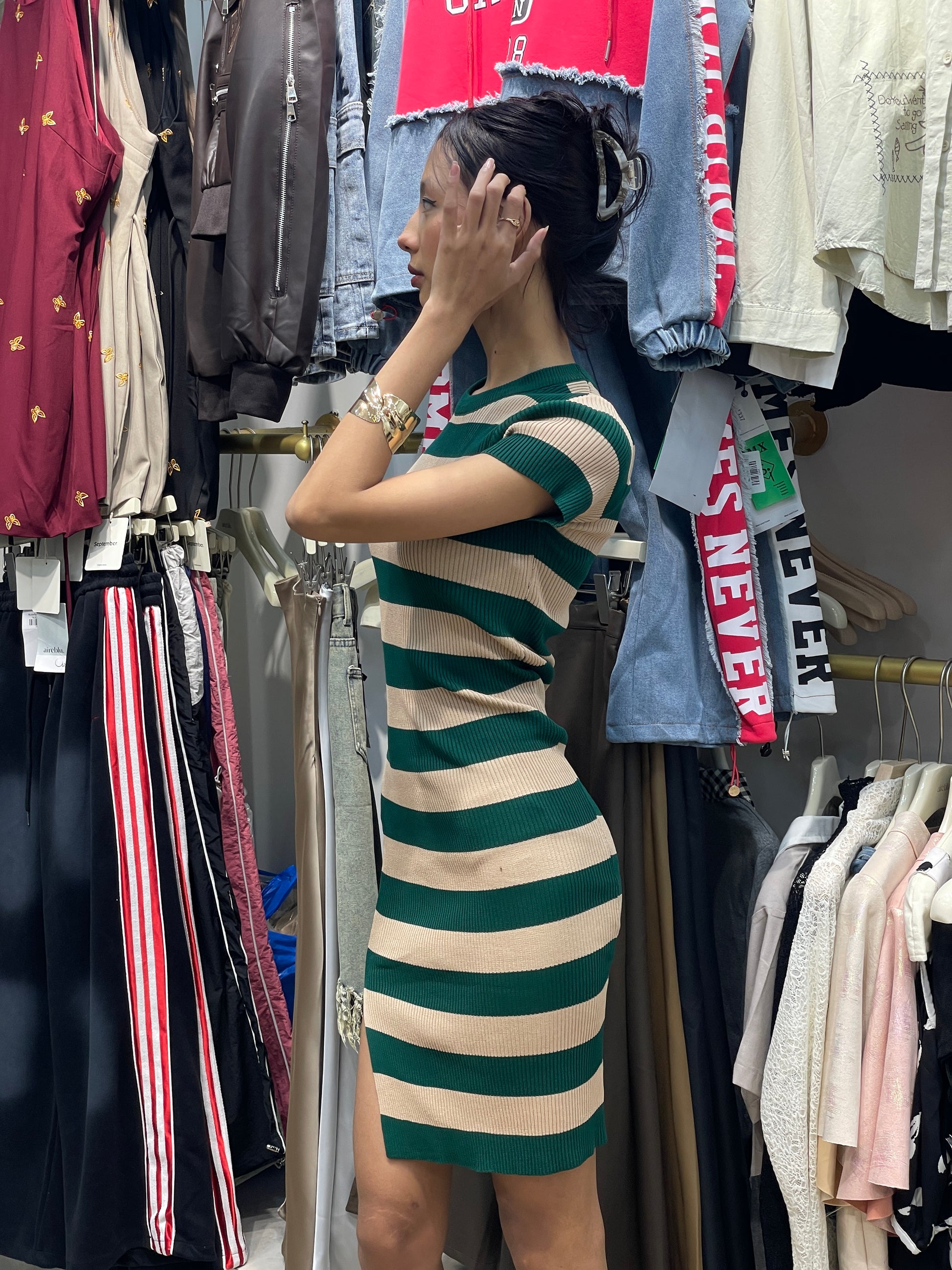 This ribbed bodycon dress hugs you in all the right places while keeping it effortless. The horizontal stripe pattern paired with a subtle side slit makes it flattering, wearable, and quietly bold — perfect for everyday slay or dressed-up evenings.