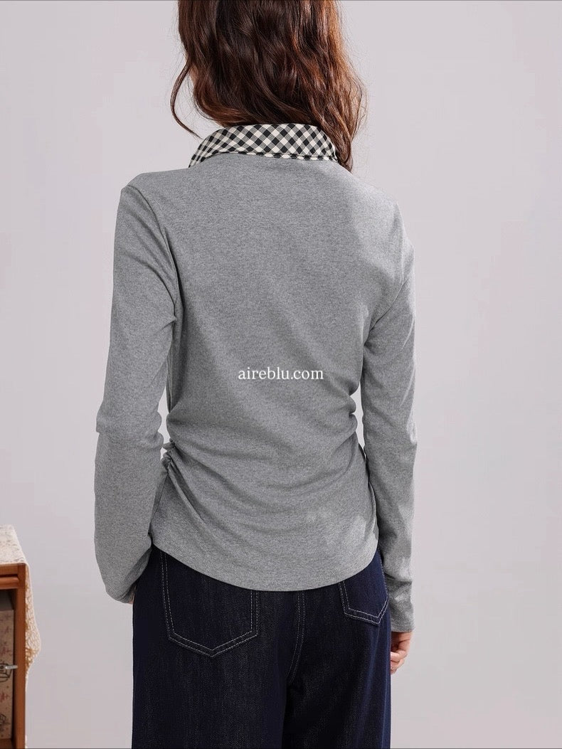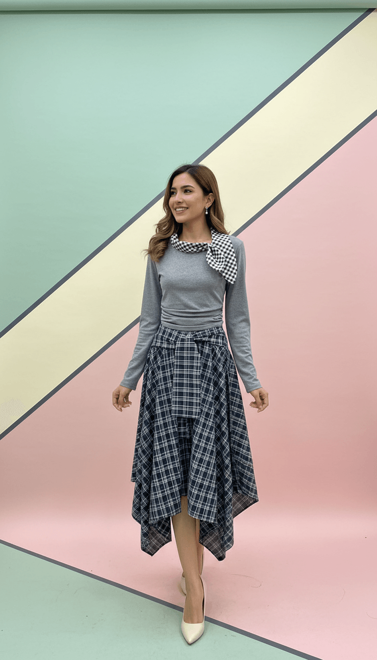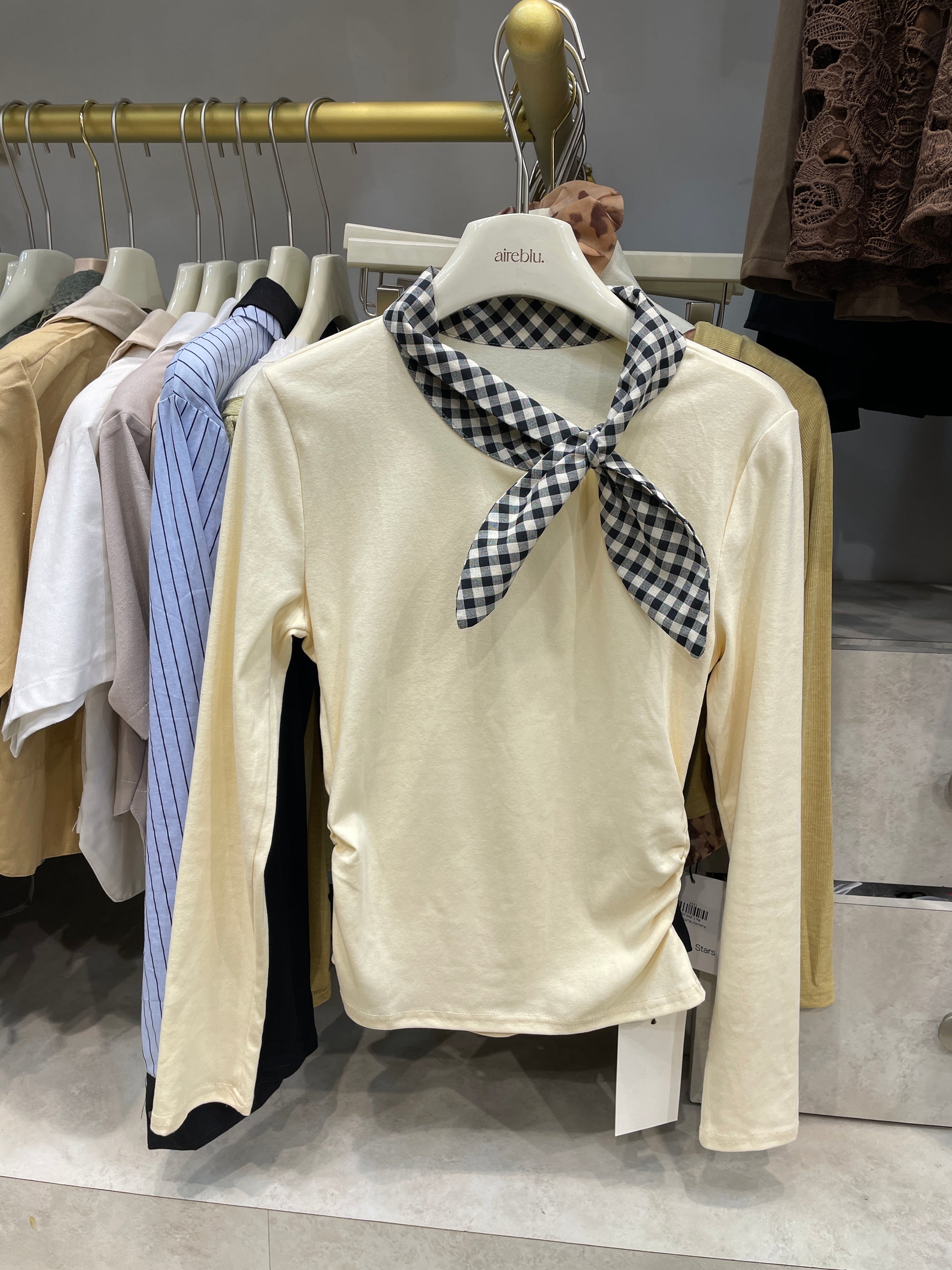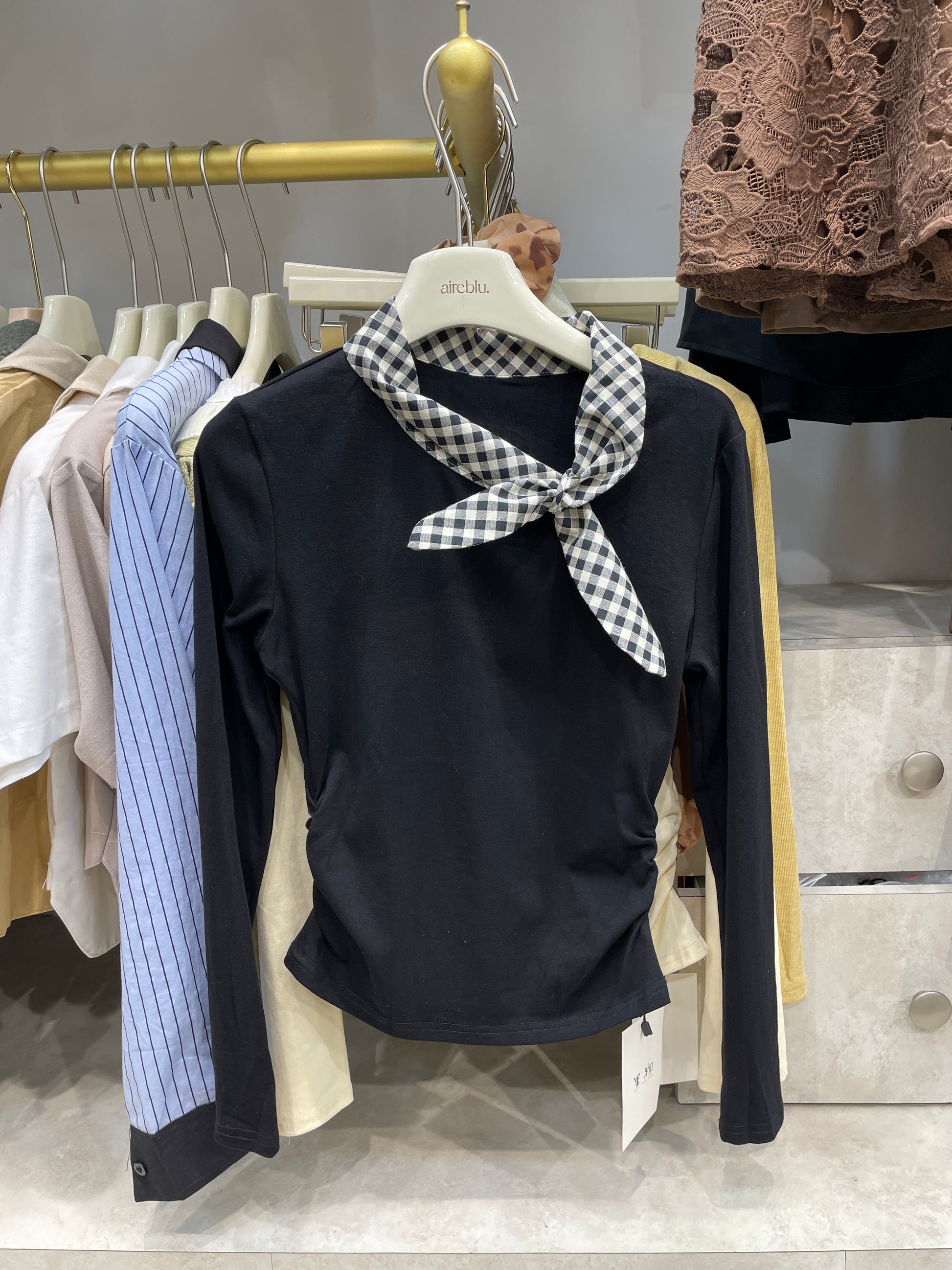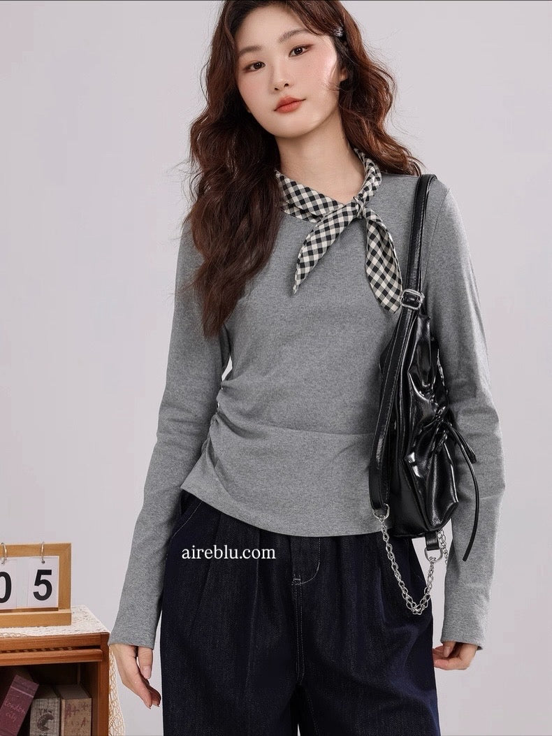 Chic, effortless, and just the right amount of cute. This long-sleeve top features a contrasting check scarf detail that instantly elevates your everyday look. Soft, stretchy, and flattering — consider this your new go-to.